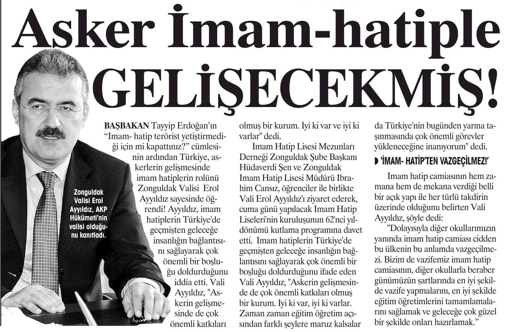 BAŞBAKAN Tayyip Erdoğan’ın "İmam- hatip terörist yetiştirmediği için mi kapattınız?" cümlesinin ardından Türkiye, askerlerin gelişmesinde imam hatiplerin rolünü Zonguldak Valisi Erol Ayyıldız sayesinde öğrendi! Ayyıldız, imam hatiplerin Türkiye’de geçmişten geleceğe insanlığın bağlantısını sağlayarak çok önemli bir boşluğu doldurduğunu iddia etti. Vali Ayyıldız, "Askerin gelişmesinde de çok önemli katkıları olmuş bir kurum. İyi ki var ve iyi ki varlar" dedi.