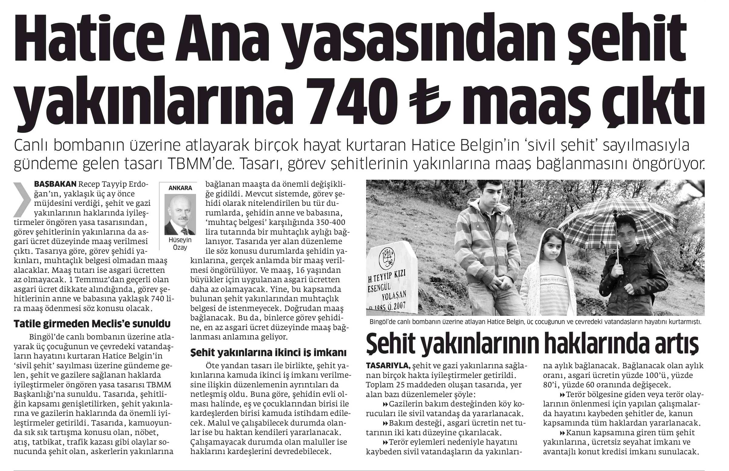 Bingöl’de canlı bombanın üzerine atlayarak üç çocuğunun ve çevredeki vatandaşların hayatını kurtaran Hatice Belgin’in ‘sivil şehit’ sayılması üzerine gündeme gelen, şehit ve gazilere sağlanan haklarda iyileştirmeler öngören yasa tasarısı TBMM Başkanlığı’na sunuldu. Tasarıda, şehitliğin kapsamı genişletilirken, şehit yakınlarına ve gazilerin haklarında da önemli iyileştirmeler getirildi. Tasarıda, kamuoyunda sık sık tartışma konusu olan, nöbet, atış, tatbikat, trafik kazası gibi olaylar sonucunda şehit olan, askerlerin yakınlarına bağlanan maaşta da önemli değişikliğe gidildi. Mevcut sistemde, görev şehidi olarak nitelendirilen bu tür durumlarda, şehidin anne ve babasına, &lsq